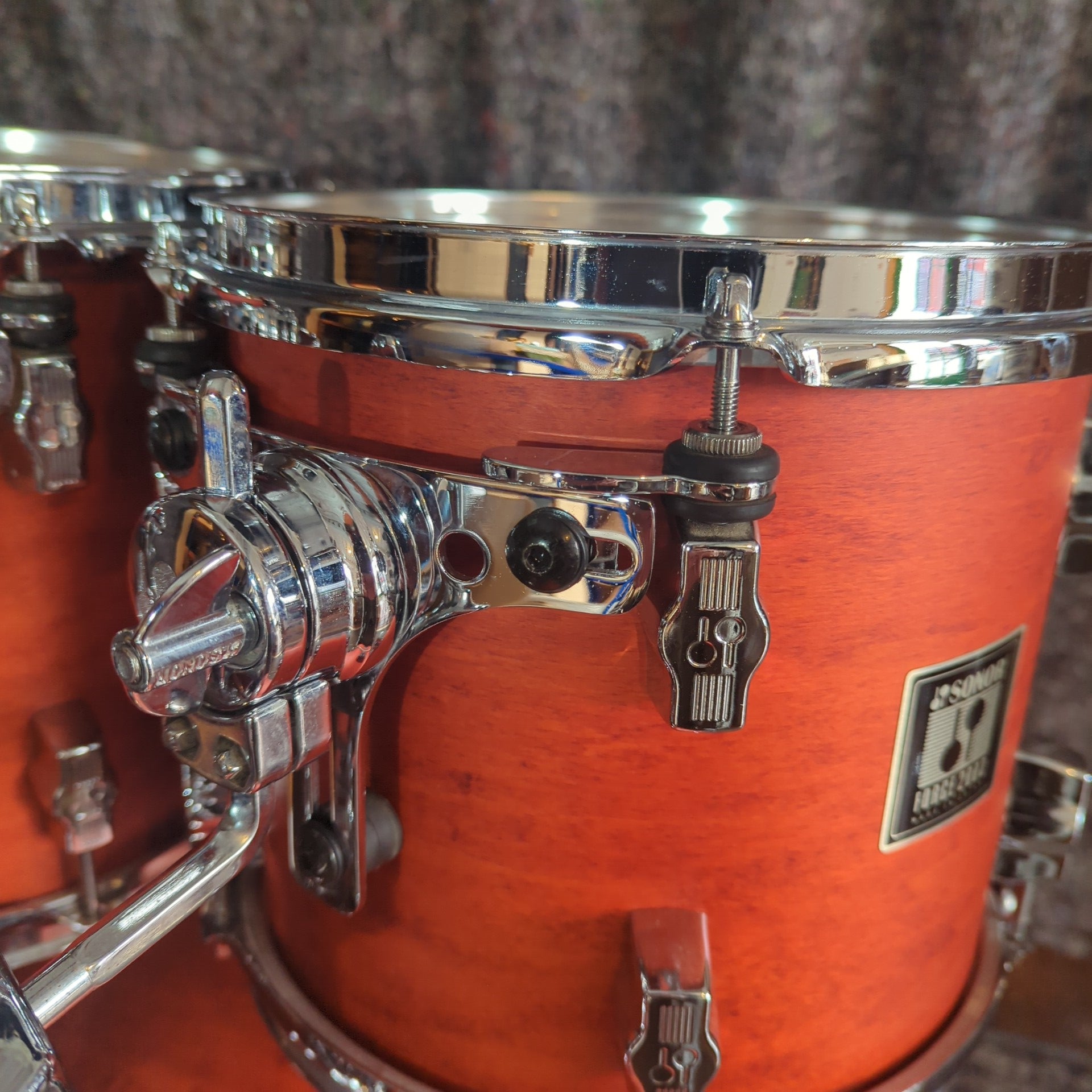 Sonor Force 2003 kit in a really nice orange stained finish. A few marks and a couple gouges on the bass drum hoops.