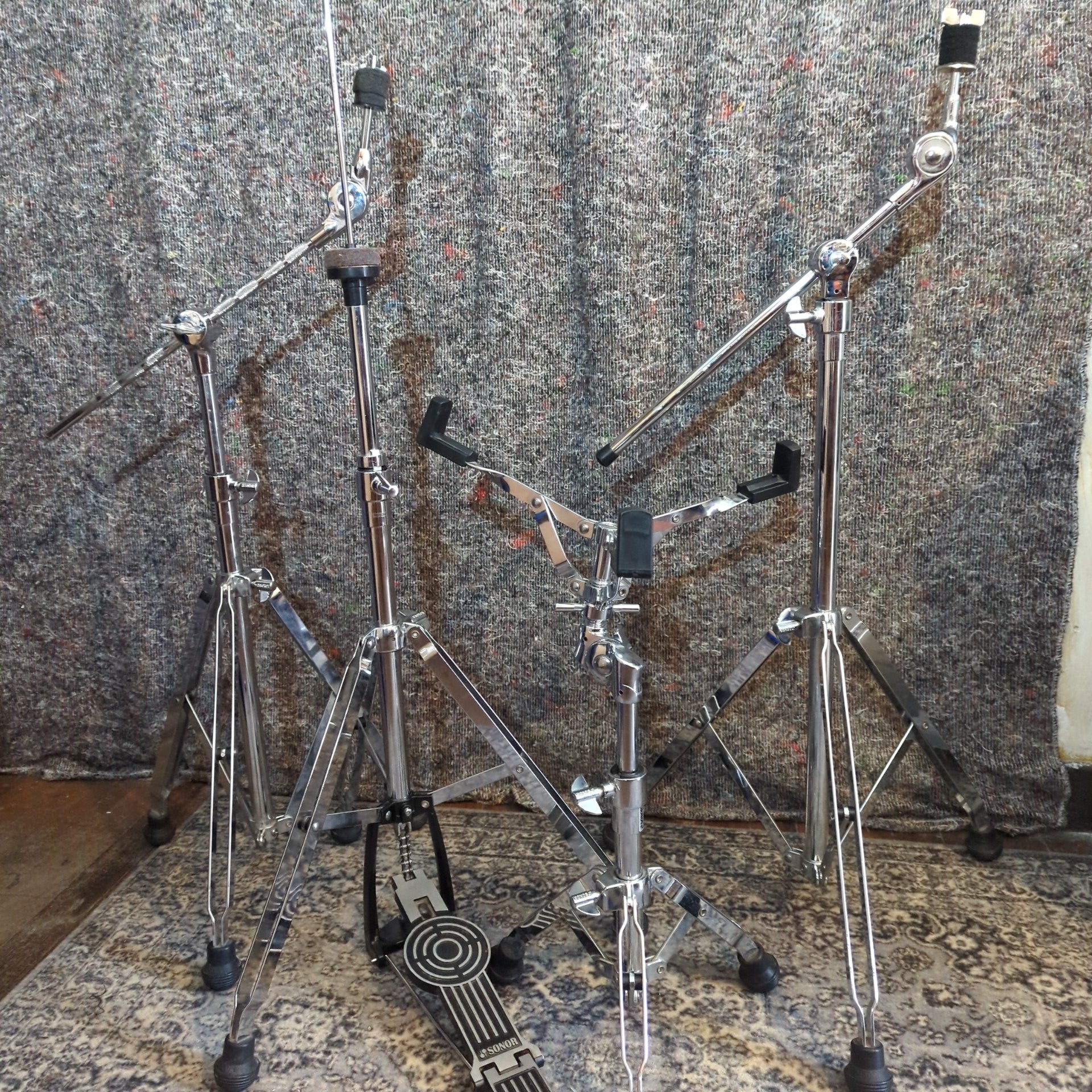The hardware included is mostly force 200 but the snare drum and one boom are a mixture of parts (see individual listings for details). 2 boom stands,1 snare stand and a hi hat stand.