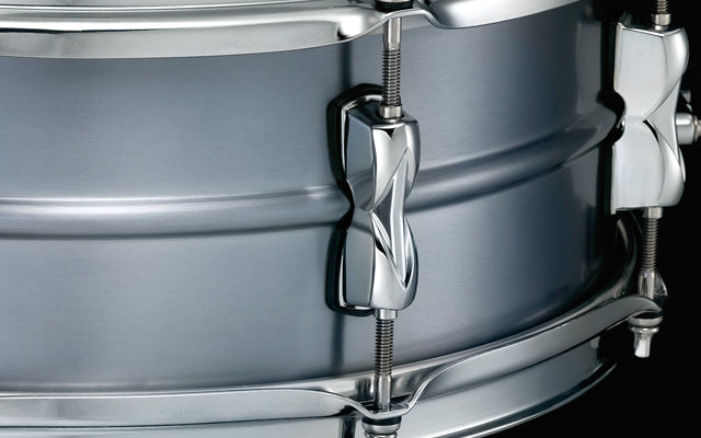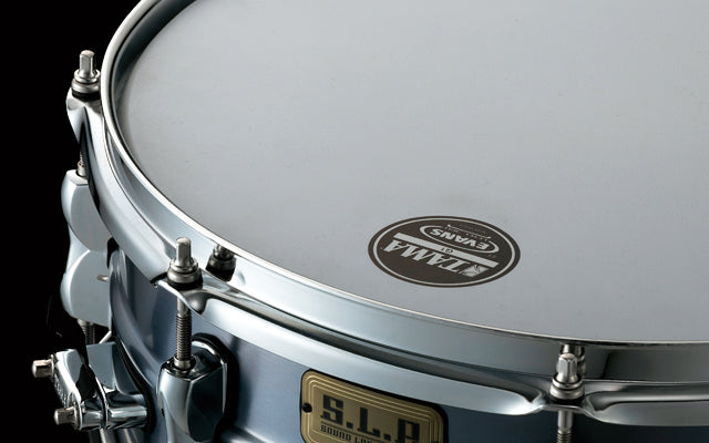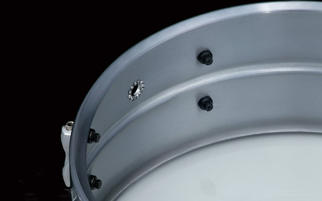 This drum features a seamless 1.2 mm Aluminum shell with a center bead. The 8-lug Steel Mighty Hoops make for a crisp sound with short sustain. The vintage look and sound are reminiscent of the early years of popular aluminum snare drums.
