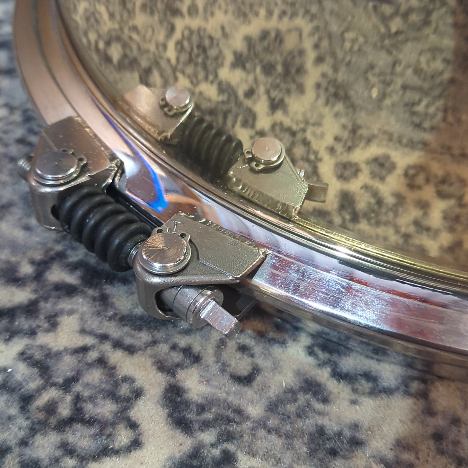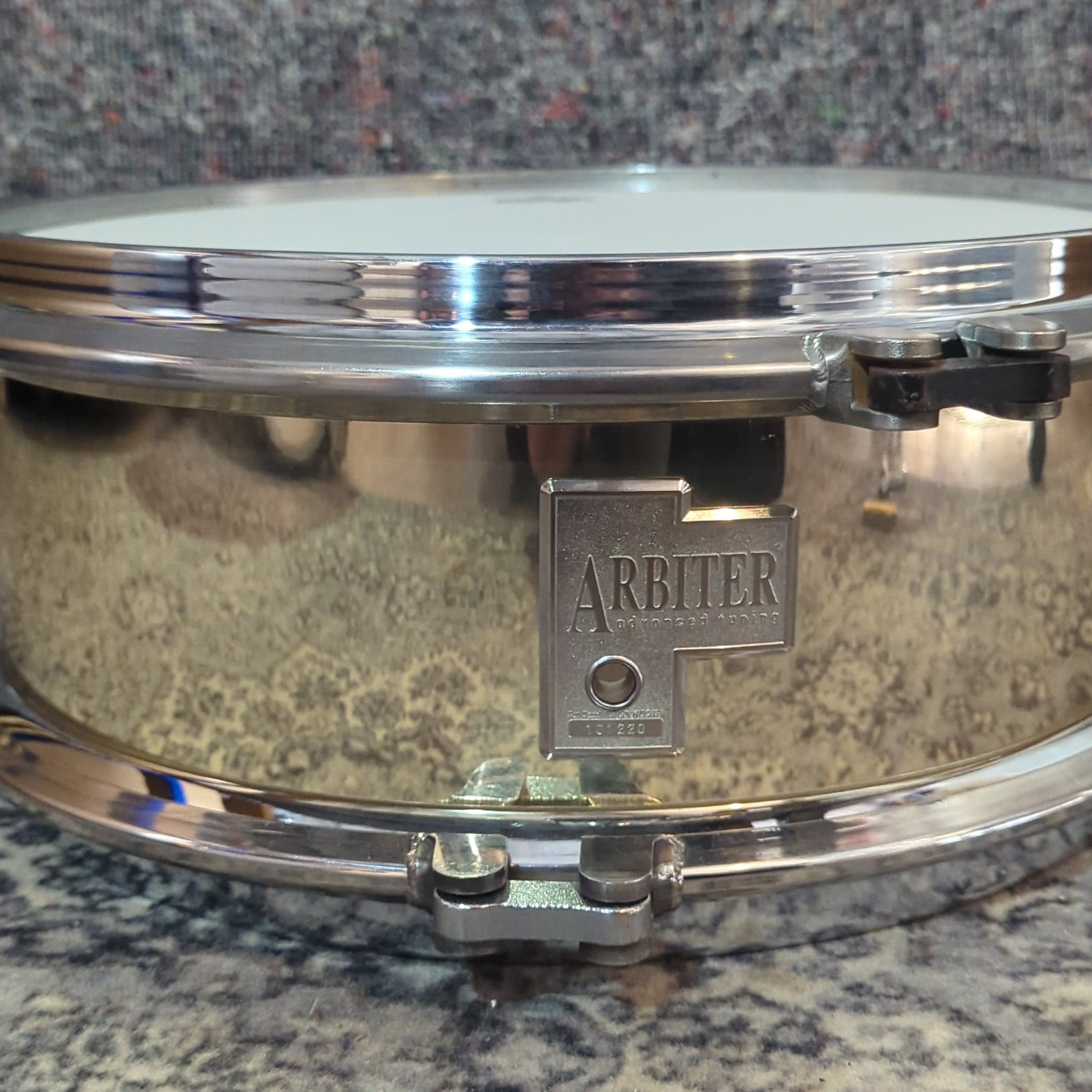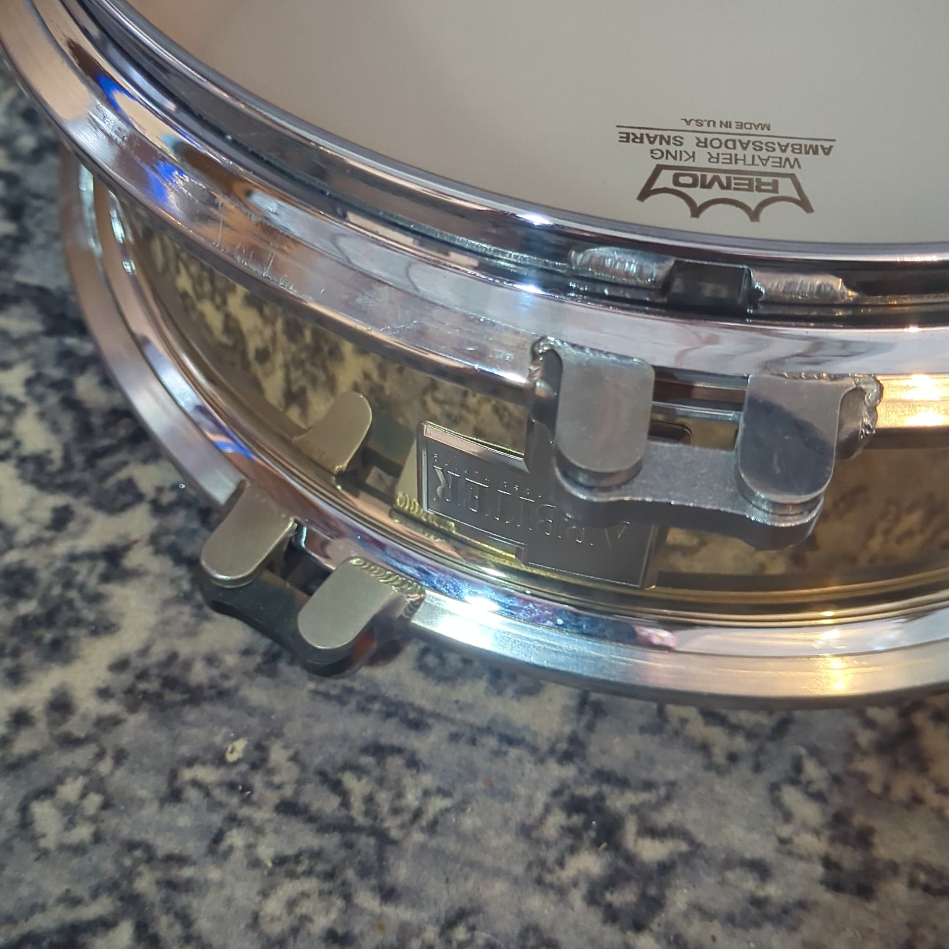 Used Arbiter AT (Advanced Tuning) 14"x5.5" Snare Drum. I'm unsure of the history potentially it's a prototype or it's a Vibrasonic Brass bit with hoops from a flats pro but I don't think they look right for that so I suspect it's a prototype. The guy I got this from certainly new people that might have been given a prototype.