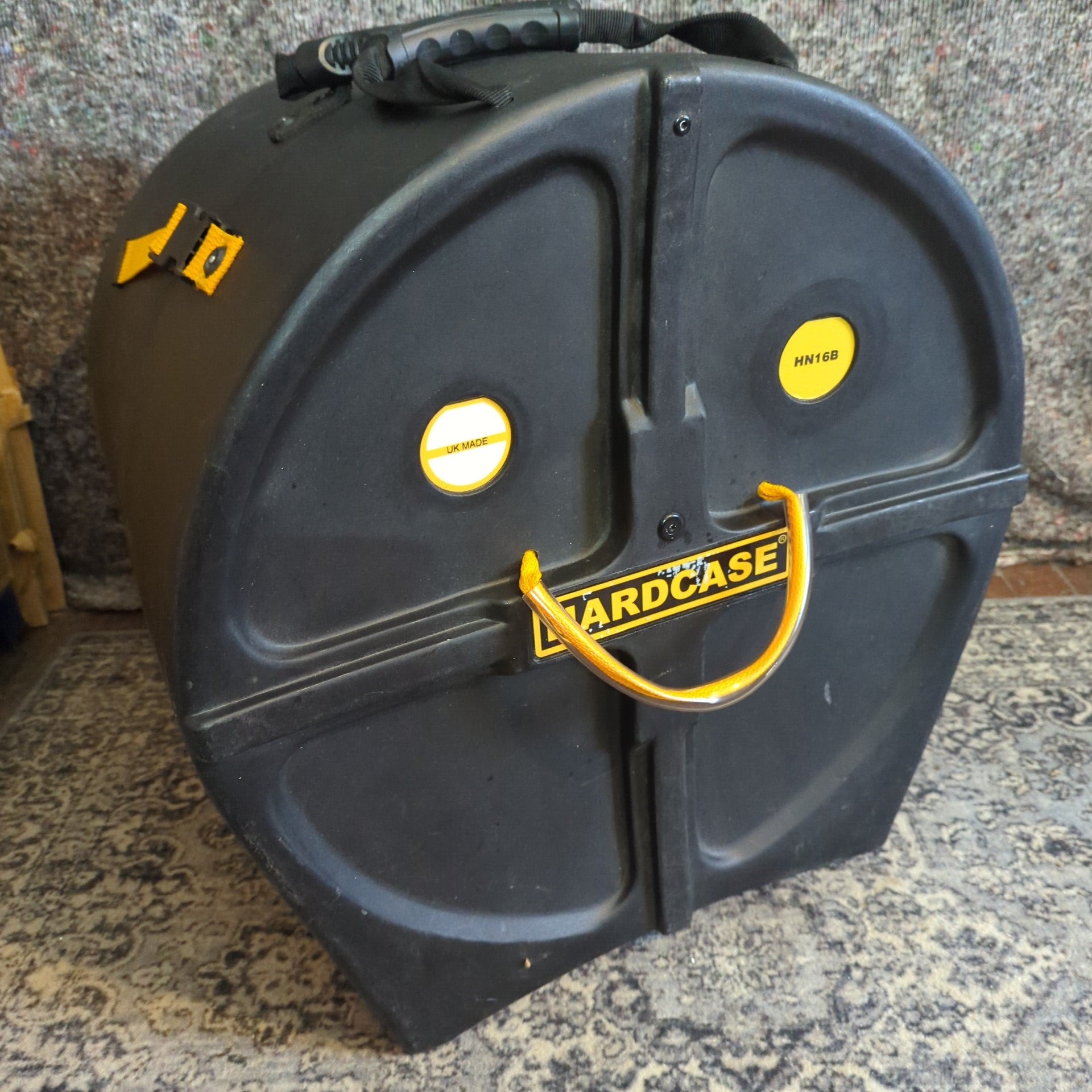 Hardcase 16" kick drum case with wheels. It's got some marks, tape residue and wee scratches but nothing that even slightly affects it's functionality.