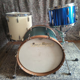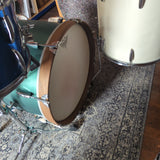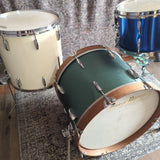 20" bass drum is a custom 20" x15" with bearing edges with a flat front edge to replicate a Ludwig signet. Walnut hoops. Tama legs, vintage Shaftesbury lugs and random tension rods and claws.